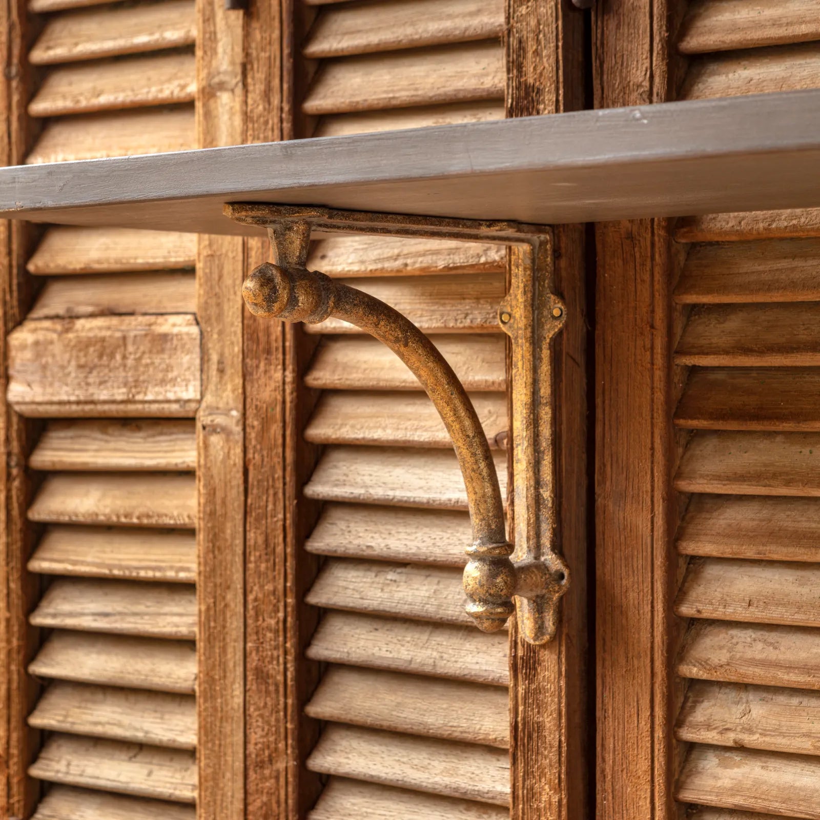 These beautifully aged gold shelf brackets help to create the open concept kitchen as well as decorative shelving.