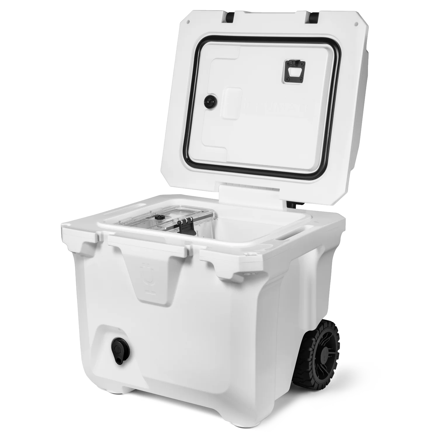 The cooler you know and love: Now available in a more compact and lighter size. The BrüTank 35qt is made for enhancing your adventures, from camping and beach days, to backyard BBQs, sporting events with the family, and more. It’s 30% lighter and smaller than its 55qt counterpart, allowing it to go wherever you go, while offering our signature removable 1.8-gallon drink tank with a built-in tap, puncture-resistant all-terrain wheels that effortlessly glide over any surface (including sand), a foam seat top, a built-in bottle opener, a wide variety of epic accessories, and 7+ day ice retention.